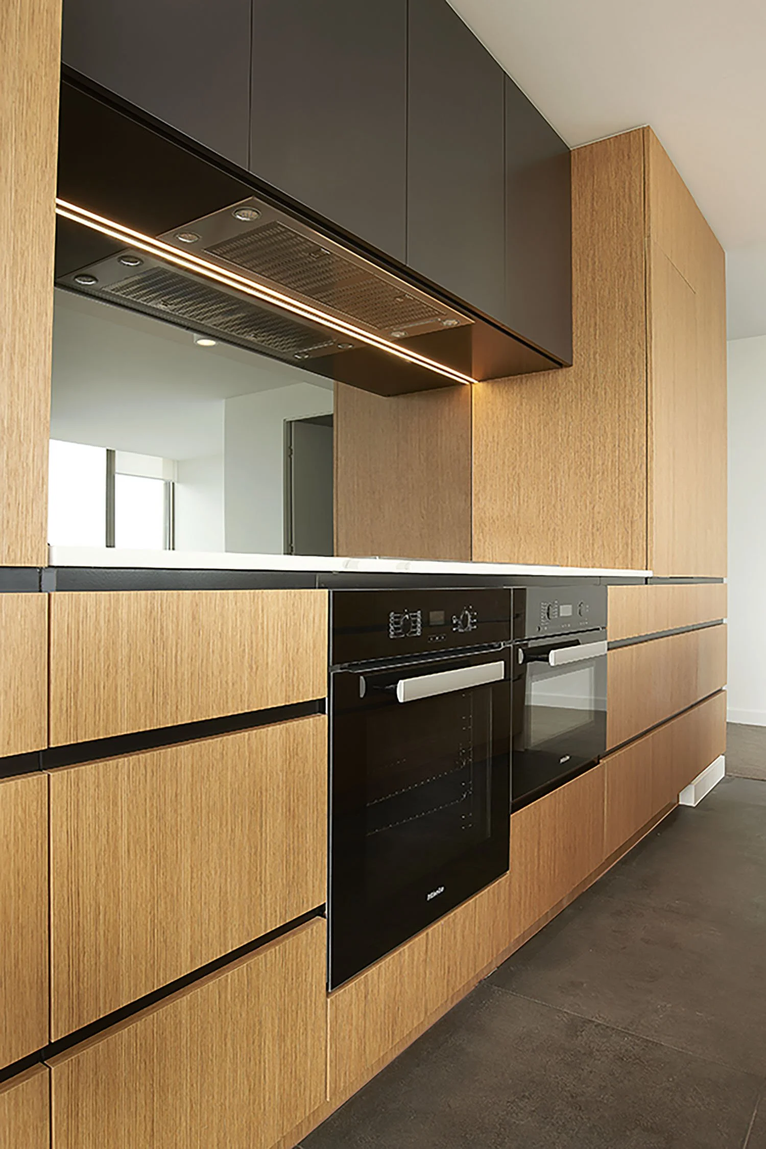 Modern touches include the beautifully-warm European oak veneer which is paired with 2pac polyurethane overhead cupboards in a Black Caviar satin finish. The Milan Cararra polished reconstituted stone is a lovely bright contrast while the triple slivered and smoked mirror splashbacks add an element of luxury and understated elegance.